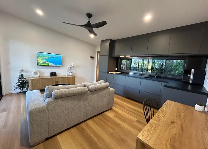 Our Treehouse Near Mooloolaba Villa villası Sunshine Coast havaalanından arabayla 15 dakikalık bir sürüş mesafesinde konaklamayı sunar. Tesisinde 1 banyo odası, 1 yatak odası ve donanımlı mini mutfak misafirlerin hizmetindedir.